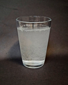 #PraTodosVerem2: A foto mostra um copo de vidro cheio de água sobre um fundo preto. A água presente no copo possui microbolhas de ar que dão um aspecto branco e turvo para o líquido.