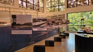 #PraTodosVerem10: Imagem mostra uma exposição de fotográfica de fotografias antigas. As imagens são dispostas em totens de vidro. O ambiente é um salão bem iluminado por luz natural e amplas janelas. Ao fundo, uma rampa de acesso.