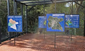 Área externa com piso de madeira e painéis mostrando mapas e explicações sobre captação de água, barragens e bacias hidrográficas de Indaiatuba. A estrutura é coberta por metal e cercada por árvores densas. O clima é de trilha educativa ao ar livre.
