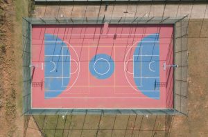 #PraTodosVerem2: Vista aérea de uma quadra poliesportiva cercada por alambrado. A quadra é colorida em vermelho e azul, com marcações para diferentes esportes, incluindo basquete, vôlei e futsal. A imagem mostra sombras dos postes de iluminação projetadas sobre o piso.