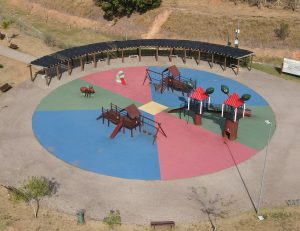 #PraTodosVerem3: Parquinho infantil visto de cima, com estrutura circular pintada em várias cores. Há brinquedos como escorregadores, casinhas e uma formiga gigante decorativa. Ao redor, um pergolado de madeira faz sombra e a área é rodeada por caminhos pavimentados.