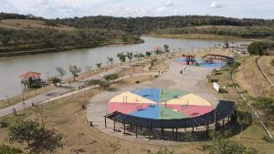 #PraTodosVerem4: Vista ampla de um parque ao lado de um corpo d’água. Há áreas circulares coloridas com brinquedos e equipamentos de ginástica ao ar livre. Árvores espalhadas, caminhos pavimentados e quiosques compõem o cenário, com morros verdes ao fundo.
