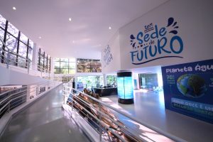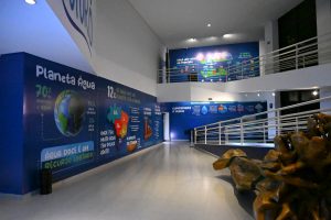 #PraTodosVerem8: Interior iluminado por janelas grandes, com rampa branca e painéis sobre preservação da água. No centro há um cilindro luminoso azul e estrutura de madeira exposta. O ambiente é claro, moderno e educativo.