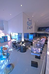 #PraTodosVerem9: Interior amplo de um centro de visitação sobre água, com balcão de atendimento preto, painéis informativos e esculturas coloridas. As paredes exibem frases educativas e vitrines. A luz natural entra por grandes janelas. O ambiente é organizado e moderno.