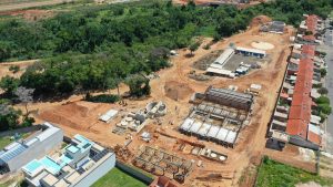 #PraTodosVerem1: Foto aérea ampla de um canteiro de obras de grande porte, com diversas estruturas em construção, incluindo tanques circulares, fundações e áreas de concreto armado. A obra está cercada por áreas verdes, ruas residenciais e outras instalações.