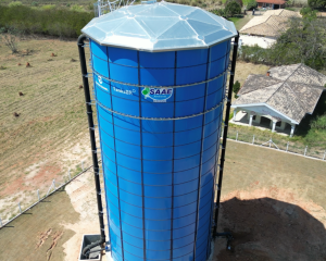 #PraTodosVerem3: Imagem aérea mostra o topo de um reservatório de água formado por chapas metálicas azuis. Existem duas tubulações pretas que vão do topo até o chão. O entorno do reservatório é uma área gramada com uma casa no lado direito da foto.