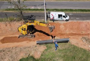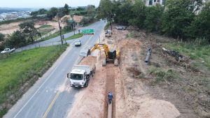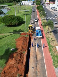 #PraTodosVerem6: Imagem aérea de uma obra de instalação de adutora ao lado de uma avenida movimentada. Há uma vala longa e profunda em frente a uma retroescavadeira. Diversos trabalhadores com uniformes azuis atuam no local, enquanto a retroescavadeira e um caminhão auxiliam no serviço. Há ciclovia vermelha ao lado da obra e área verde com árvores do outro lado.