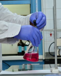 #PraTodosVerem3: Imagem mostra um frasco de vidro com um líquido de cor rosa em seu interior. O fraco é segurado por uma pessoa, da qual vemos apenas as mãos que calçam luvas de látex azuis.