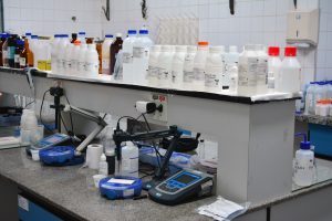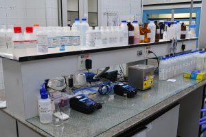 #PraTodosVerem1: Imagem mostra o balcão de um laboratório. Sobre a parte superior do balcão estão dispostas dezenas de frascos. Na parte inferior, equipamentos de análise com telas e botões.