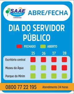 O Serviço Autônomo de Água e Esgotos (Saae) informa o regime de funcionamento do Escritório Central, Museu da Água e Parque do Mirim entre os dias 25 de outubro (sábado) e 28 de outubro (terça-feira, dia do servidor público).
