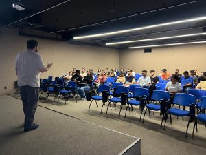 #PraTodosVerem4: Em um auditório, um homem fala sobre um palco enquanto cerca de 30 pessoas observam a palestra.