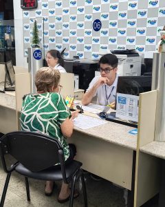 #PraTodosVerem1: A imagem mostra a cena de um balcão de atendimento onde uma mulher está sentada de um lado do guichê e do outro lado, separados por um vidro, um homem também sentado com um computador.