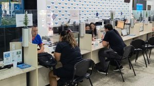 #PraTodosVerem2: A imagem mostra a cena de um balcão de atendimento. São diversos guichês com divisórias de vidro. Em dois desses guichês, pessoas são atendidas por funcionários do Saae.